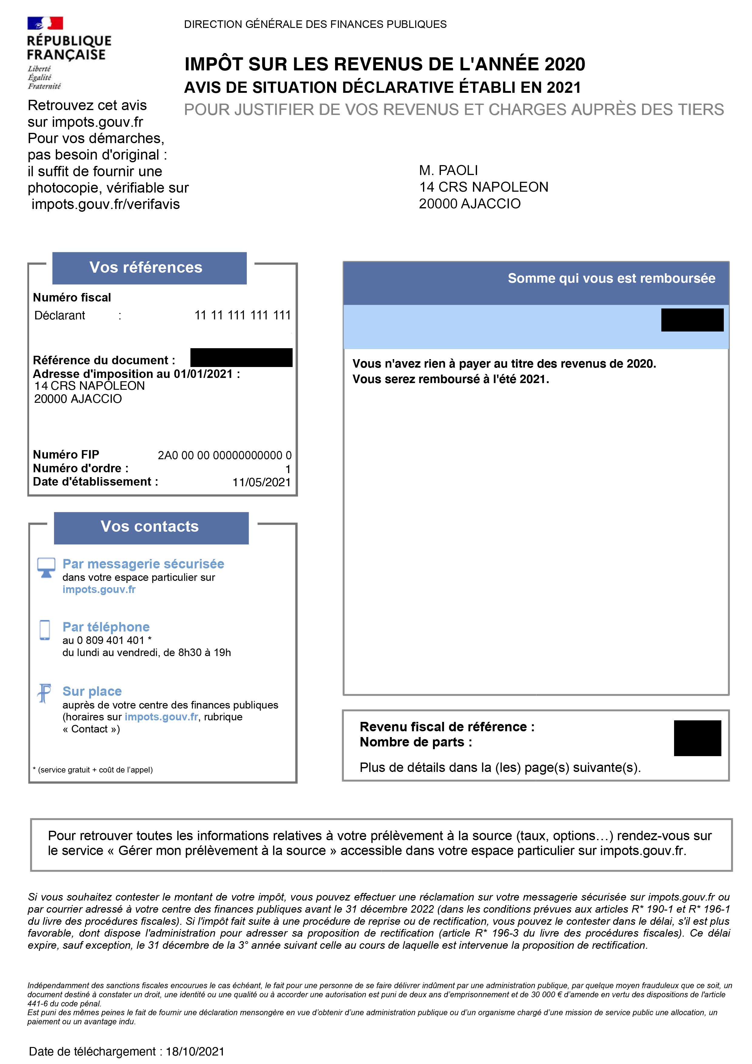 ** Pour des raisons de confidentialité : les montants correspondant aux revenus et à l'imposition doivent être masqués par l'intéressé(e) préalablement au téléchargement de sa situation déclarative à l'impôt. Attention l'Avis de Situation Déclarative à l'Impôt sur les Revenus n'est pas un justificatif qui atteste d'un changement récent de domiciliation fiscale à n'importe quel moment de l'année. Plus d'informations sur notre FAQ.