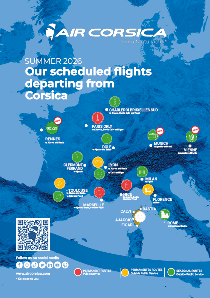 Siete alla ricerca di informazioni non commerciali su Air Corsica? Informazioni non legate al vostro viaggio sulle nostre rotte, ma piuttosto su Air Corsica in generale: la sua identità, il suo marchio, la storia della sua creazione e del suo sviluppo, la sua flotta, la sua rete, le sue dimensioni in poche cifre chiave: se volete semplicemente saperne di più su di noi, tutto è a vostra disposizione in questa sezione.